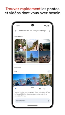 Retrouvez instantanément n'importe quel moment grâce à une recherche intuitive par description naturelle, que ce soit « Emma qui peint dans le jardin » ou « Alice et moi en train de rire ». Replongez dans vos plus beaux souvenirs, transformez-les en livres photo ou en tirages (disponible dans certaines régions), et partagez-les sans effort avec vos proches, même s'ils n'utilisent pas Google Photos. Et avec Google Lens en aperçu, explorez ce que vous voyez : identifiez du texte ou des objets dans vos images pour en savoir plus et interagir avec le monde qui vous entoure, faisant de Google Photos bien plus qu'une simple galerie.