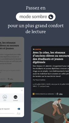 Le Monde s'engage pour une expérience de lecture optimale et entièrement personnalisable. Adaptez votre affichage grâce au mode "sombre" et ajustez la taille de la police pour un confort visuel idéal, à tout moment. Marquez les articles que vous souhaitez lire ultérieurement pour ne rien manquer de ce qui vous intéresse. Personnalisez vos rubriques favorites pour un accès instantané aux sujets qui vous touchent. Le Monde vous offre un traitement fiable et exhaustif des événements majeurs, qu'il s'agisse de l'actualité en France, en Europe ou à travers le monde, couvrant des domaines allant de l'International à la Planète, la Politique, la Société, l'Économie, le sport, la science, la technologie, la culture et l'art.