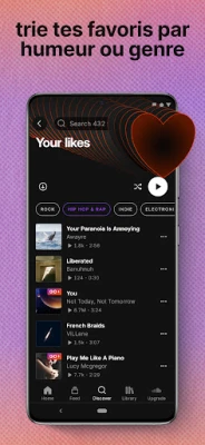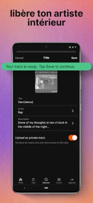 Sculptez votre bande-son personnelle avec une précision inégalée. Lancez des playlists sur mesure qui s'adaptent à chaque humeur, ou laissez-vous porter par des mix et mixtapes personnalisés inspirés de vos coups de cœur. Chaque son qui résonne en vous – qu'il s'agisse d'un hit planétaire, d'une pépite underground ou d'un set de DJ exclusif – peut être sauvegardé pour enrichir votre collection. Créez la discothèque de vos rêves, toujours à portée de main, et accédez à des contenus uniques que seule SoundCloud peut vous offrir.