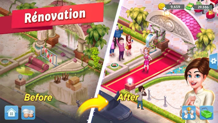 Au-delà de la cuisine, Star Chef 2 déploie un univers de gestion hôtelière captivant. Cuisinez, pâtissez et grillez des merveilles pour satisfaire une clientèle exigeante, tout en gérant un hôtel dynamique qui prend vie avec des événements exclusifs : concerts, visites de célébrités, et soirées piscine mémorables. L'esprit entrepreneurial est mis à l'honneur alors que vous développez votre propre ferme, concevez et personnalisez votre restaurant avec des décors uniques, et agrandissez votre empire culinaire. Avec plus de 150 quêtes scénarisées, chaque jour apporte son lot de nouvelles histoires et de défis passionnants, enrichissant votre parcours de chef et de gestionnaire.